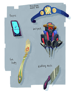 I added my preliminary character sketches at the end here - the finals ended up being a mix between the middle row of characters and the set on the far right. The latter were my first choice, having been inspired by Barbarella, but the costume aspect of it felt a little too over-the-top for what they were supposed to be.